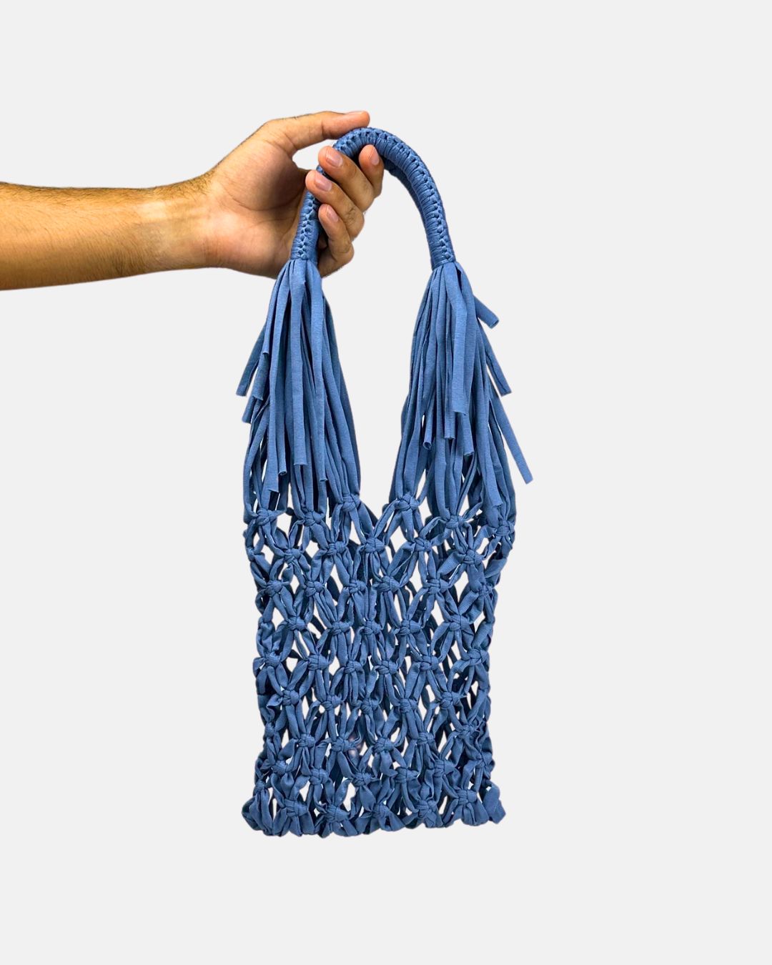 Bolsa em macramê com fio de malha na cor azul.